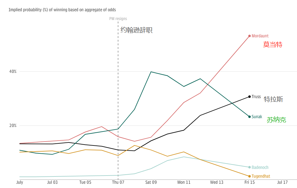 据英国《每日电讯报》综合各家博彩网站的赔率后得出的排行,莫当特当选党首的概率在7月12日左右超过苏纳克。截至发稿时,莫当特的获胜概率为54%,苏纳克的概率已经掉到23%,排名第三,低于特拉斯的30%。