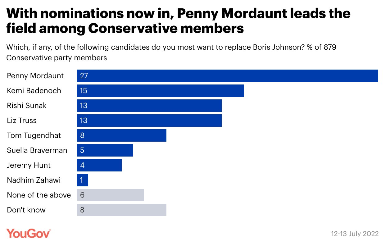 英国民调公司YouGov对879名保守党党员所做的民意调查,截至7月13日,莫当特在接受调查的保守党党员里的支持率为27%,是苏纳克(13%)的一倍多。第二名为前国务大臣凯米·巴德诺赫,支持率为15%。由于保守党新党首的最后一轮角逐将由全体保守党成员来投票,因此党员民调的参考意义十分重要。