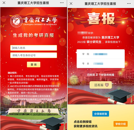 学校通过向2022级研究生新生推送“考研喜报”小程序,开展喜报宣传活动,鼓励新生分享考研成功的喜悦,发动亲朋好友为自己点赞送祝福,不断扩大学校“朋友圈”。