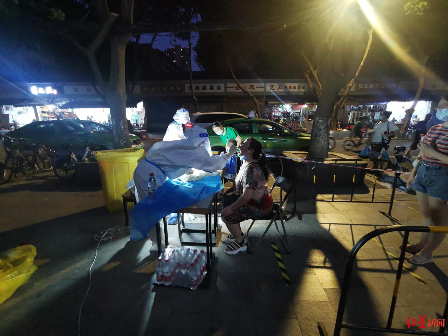 晚上8点,检测人员进行轮换,其中一人脱掉防护服,后背的衣服已全部湿透,脸上还有明显的防护镜压过的痕迹。该名检测人员告诉红星新闻记者,现场一共有4名检测人员,2人一组,一小时轮换一次,直到社区人员检测完毕。