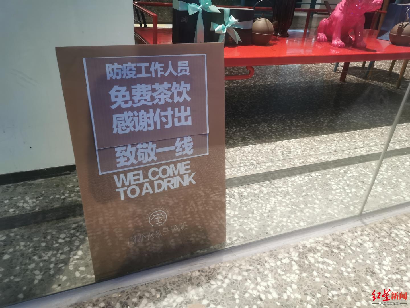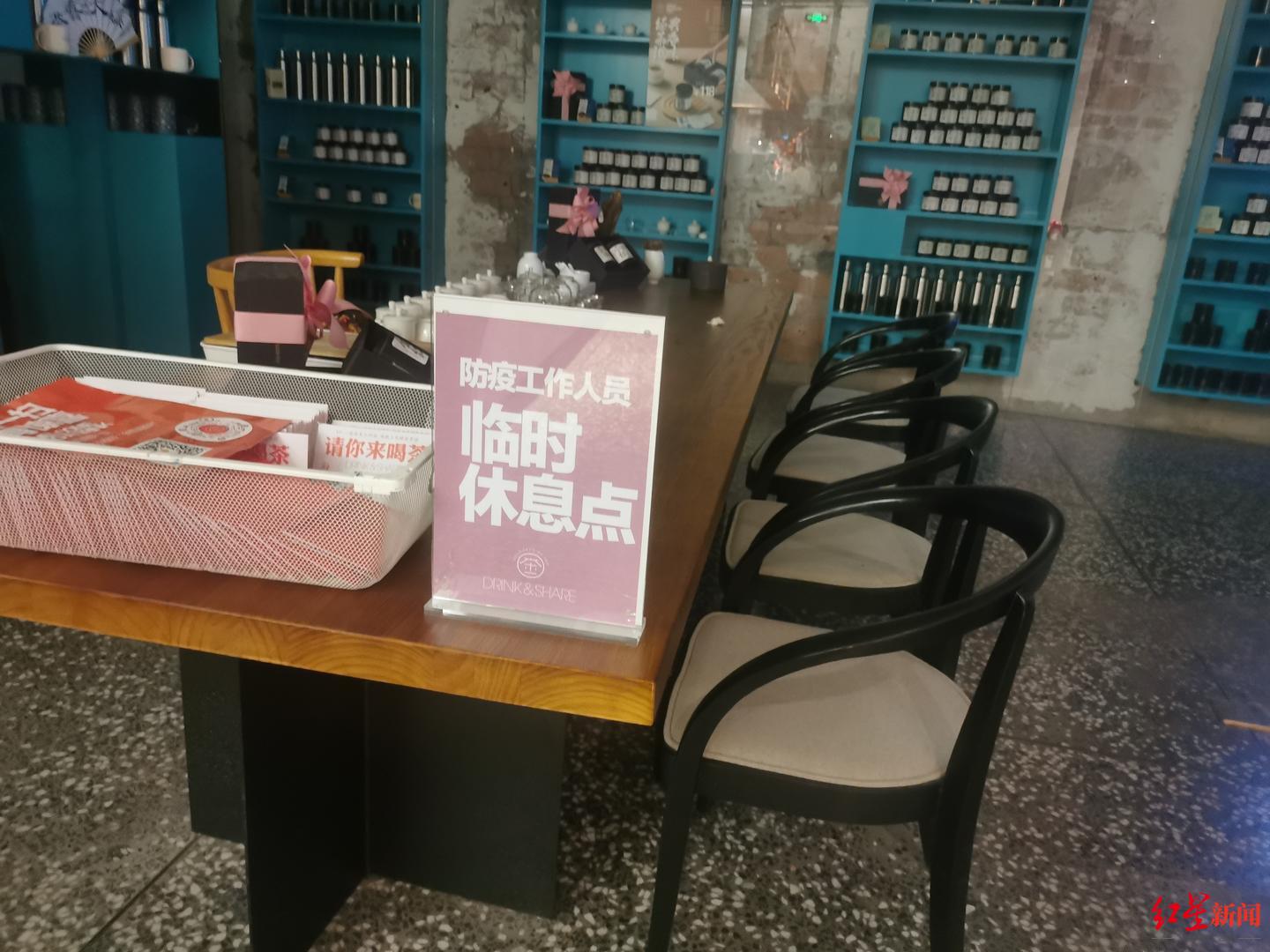 红星新闻记者在现场看到,核酸检测点正好设置在金楼阁茶室外,店老板提供了桌椅板凳给工作人员,还在店里设置了防疫人员休息区,提供免费冷泡茶。而对面王记家常菜老板邓先生则将店里的大风扇和插线板搬了过来,让防疫人员可以吹吹风,避免中暑。