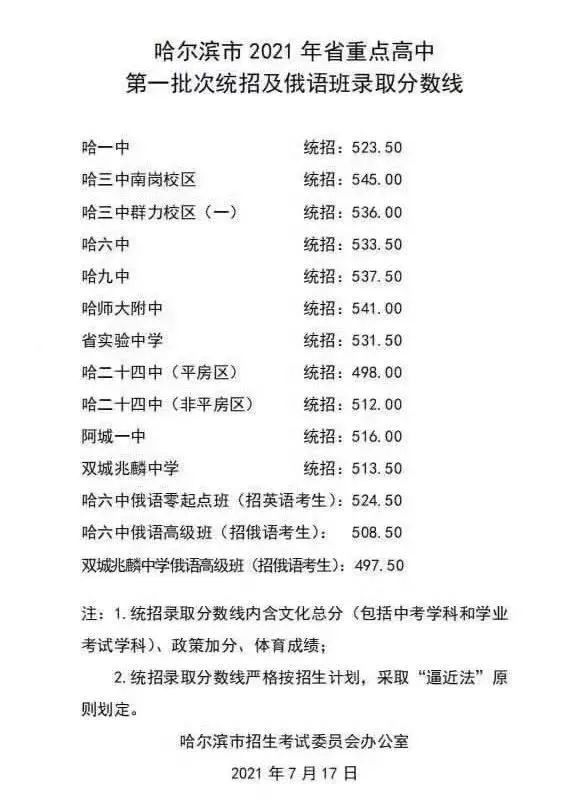哈尔滨市教育局今天公布哈市2022年省重点高中第一批次统招及俄语班录取分数线,与去年省重点高中第一批次统招分数线相比,今年哈市省重点高中一批次统招录取分数线均高于去年。