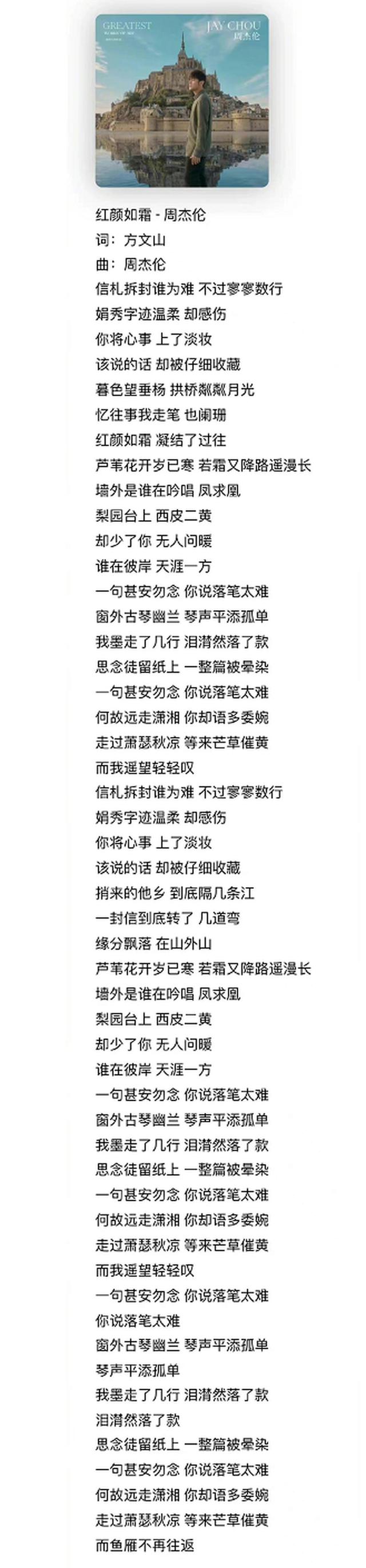 除此以外,有细心的网友发现,其中《倒影》的歌词,周杰伦之前曾在其海外社交媒体上透露过,最终,方文山做了一点改动。将“居无定所的云,城墙外的世界,你是那片我带不走的风景”改成了“你的倒影是我,带不走的风景,就像居无定所的云还在旅行。”