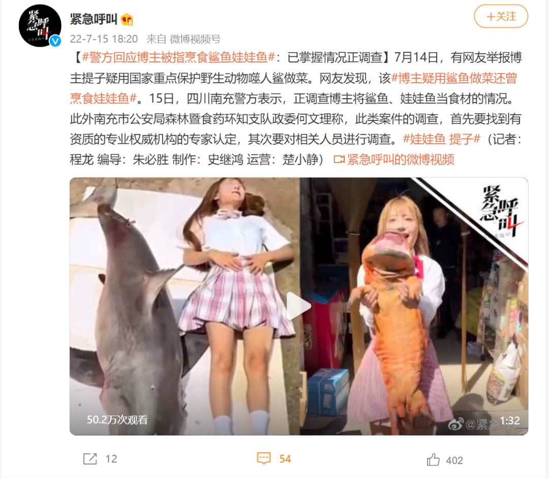 据@紧急呼叫,15日,四川南充警方表示,正调查博主将鲨鱼、娃娃鱼当食材的情况。此外南充市公安局森林暨食药环知支队政委何文理称,此类案件的调查,首先要找到有资质的专业权威机构的专家认定,其次要对相关人员进行调查。
