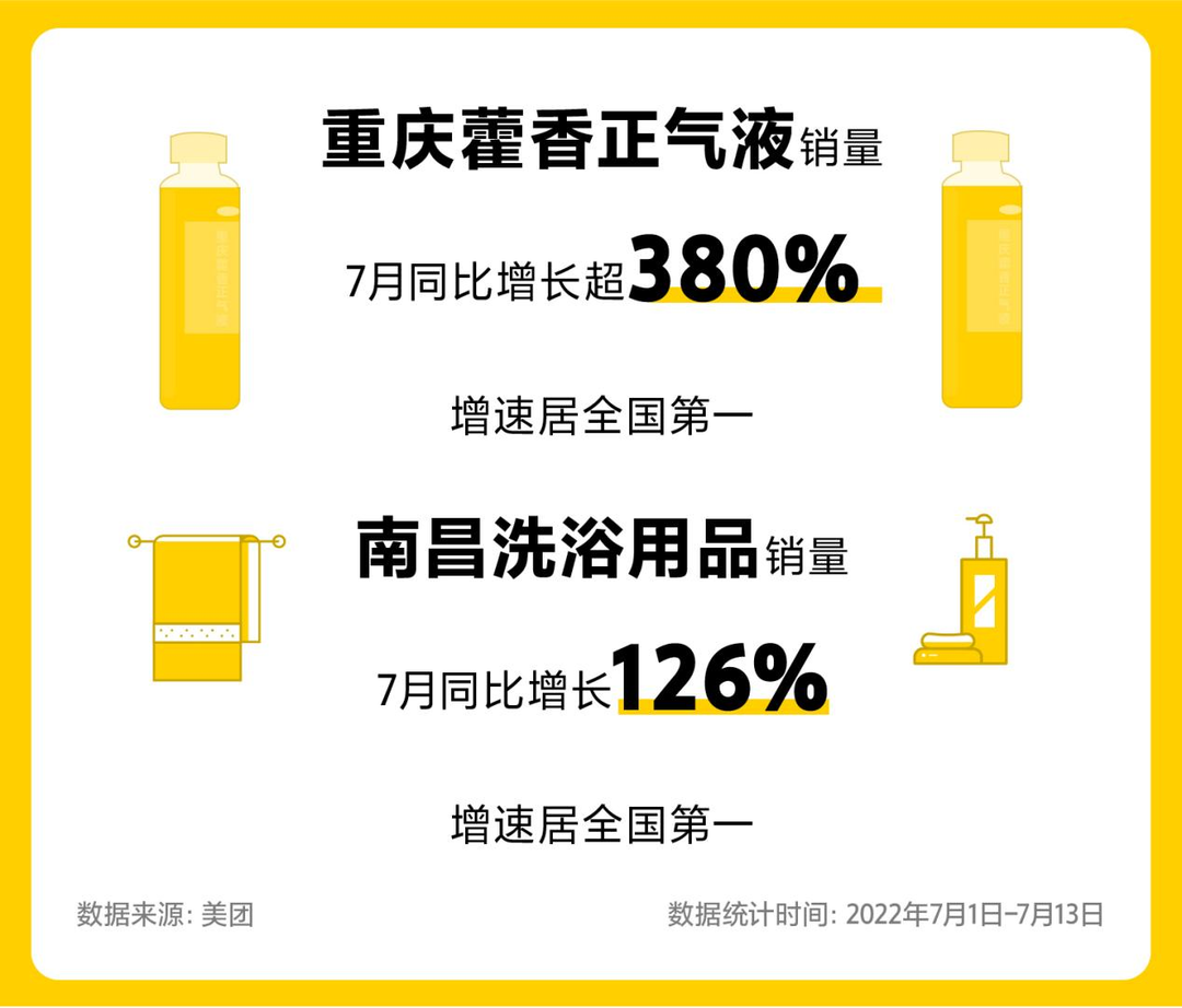 数据显示,7月以来,美团平台冰贴销量同比增长超140%,“食用冰块”销量同比增长超133%。成都成为全国范围内,冰块销量增速最快的城市。位于同一“热区”的重庆,藿香正气液的销量增速同比增长超380%,稳居全国第一。