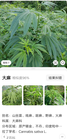7月15日早上,郝先生像往常一样进入大黑山景区晨练。不过,当他走到景区南售票口前50米的道边时,突然发现几十株绿植不太寻常。该绿植高近1米,叶片呈掌状,边缘有裂纹,表面深绿有糙毛,与普法禁毒栏目中提到的大麻高度相似。随后,郝先生使用拍照识花软件鉴别出,该绿植与大麻相似度96%!