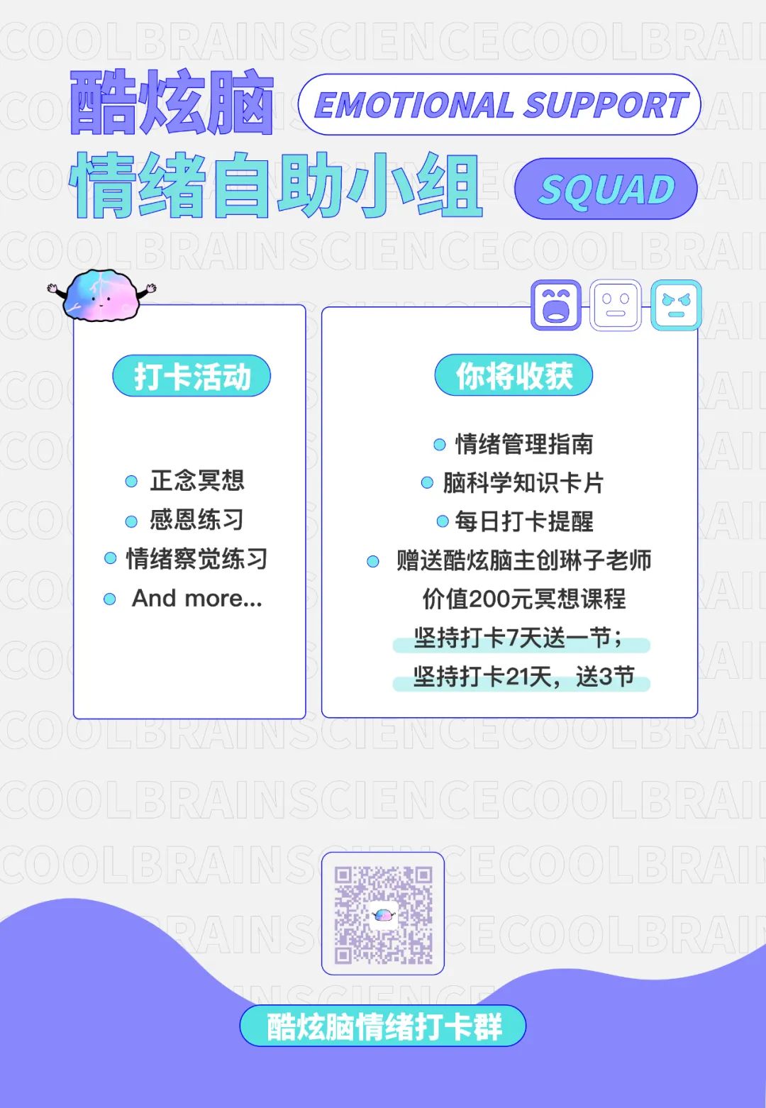 酷炫脑情绪自助打卡小组成立啦!参与每日情绪觉察打卡活动,可获得酷炫脑主创小姐姐琳子的冥想课程哦~