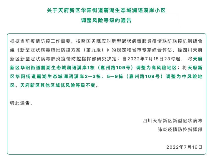记者今天(7月16日)获悉,四川天府新区新型冠状病毒肺炎疫情防控指挥部发布公告,天府新区华阳街道麓湖生态城澜语溪岸1栋(嘉州路109号)调整为高风险地区,天府新区华阳街道麓湖生态城澜语溪岸2—3栋、5—9栋(嘉州路109号)调整为中风险地区。