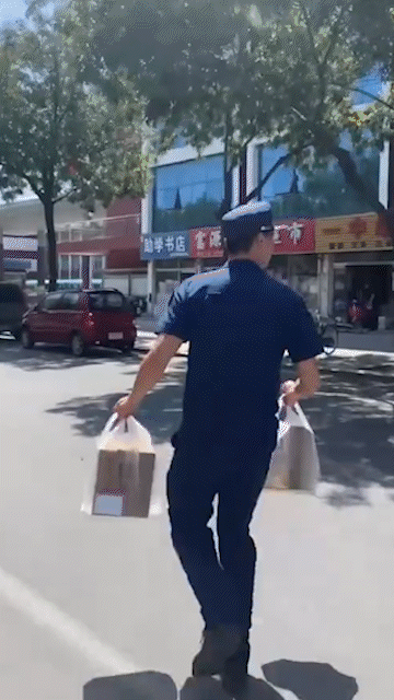 她将一袋子东西放在消防站门口