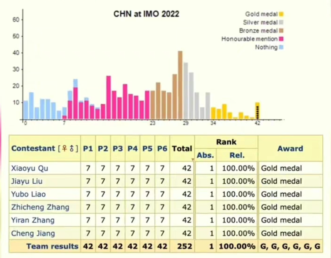 2022年,入选国家队,出征第63届国际数学奥林匹克(IMO)赛场,与其他五名中国国家队队友分别同时斩获满分,以252分的成绩获团体总分第一名,获国际金牌。
