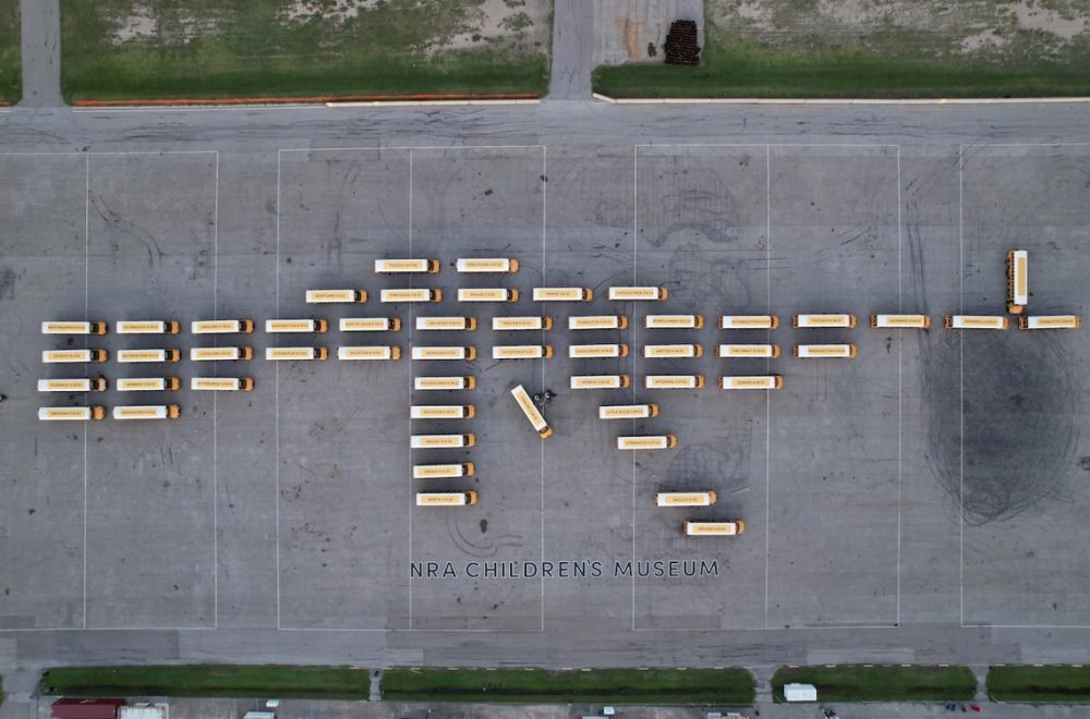 52辆校车被摆成突击步枪的形状,绵延1.6公里。校车上4368个空座位,哀悼自2020年以来死于枪支暴力的儿童。其中,第一辆校车上,还放置了校园枪击案受害者的遗物,包括遗照和球衣等。