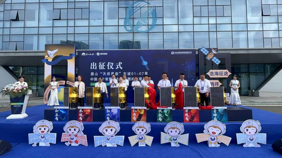 “眉山天府星座东坡01-07星出征!”7月17日上午7点07分,四川眉山天府新区党工委常务副书记廖仁军一声令下,7颗以东坡命名的卫星,从吉林长春出发,将于近期在太原卫星发射中心通过运载火箭一同升空,进入地球同步轨道。