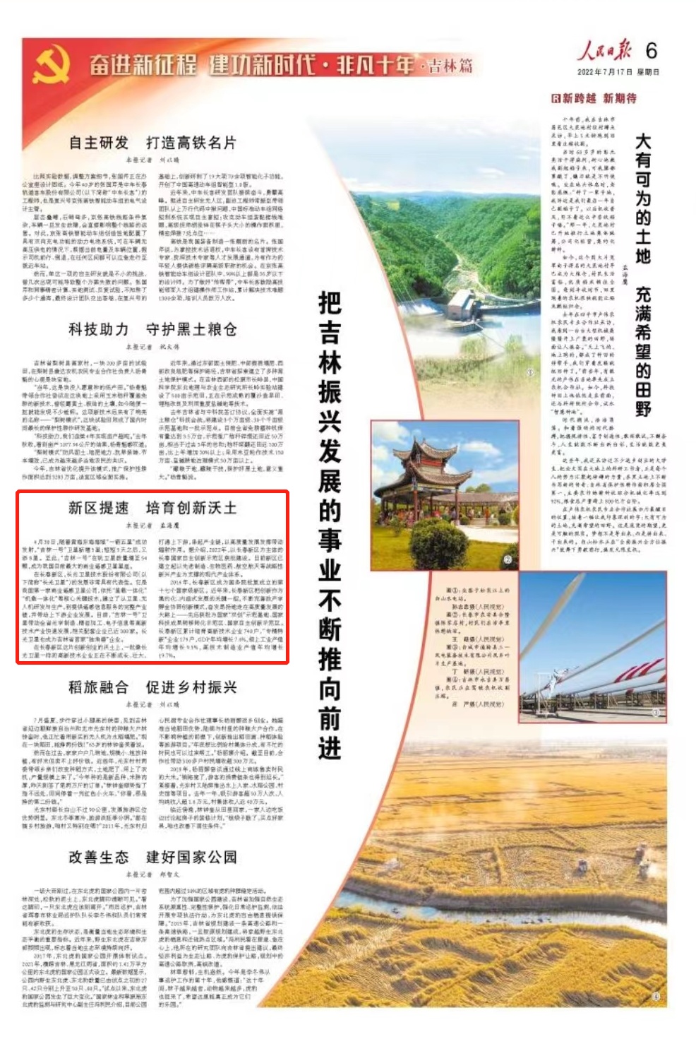 2016年,长春新区成为国务院批复成立的第十七个国家级新区。近年来,长春新区把创新作为集约化、内涵式发展的关键一招,不断完善政产学孵金协同创新模式,奋发昂扬地走在高质量发展的大路上——先后获批为国家“双创”示范基地、国家科技成果转移转化示范区、国家自主创新示范区。长春新区累计培育高新技术企业740户,“专精特新”企业179户,GDP年均增长7.6%,规上工业产值年均增长9.5%,高技术制造业产值年均增长19.7%。