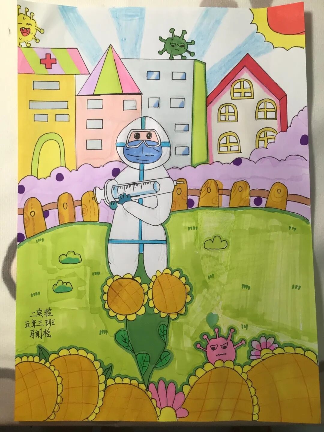 吉林省通化市东昌区第二实验小学的队员马闻桧画了一幅画,与我们分享了他心目中的英雄——白衣天使。闻桧说:“面对危险,您们毫不犹豫冲在前线,只为保护身后的人民,向您们致敬。”