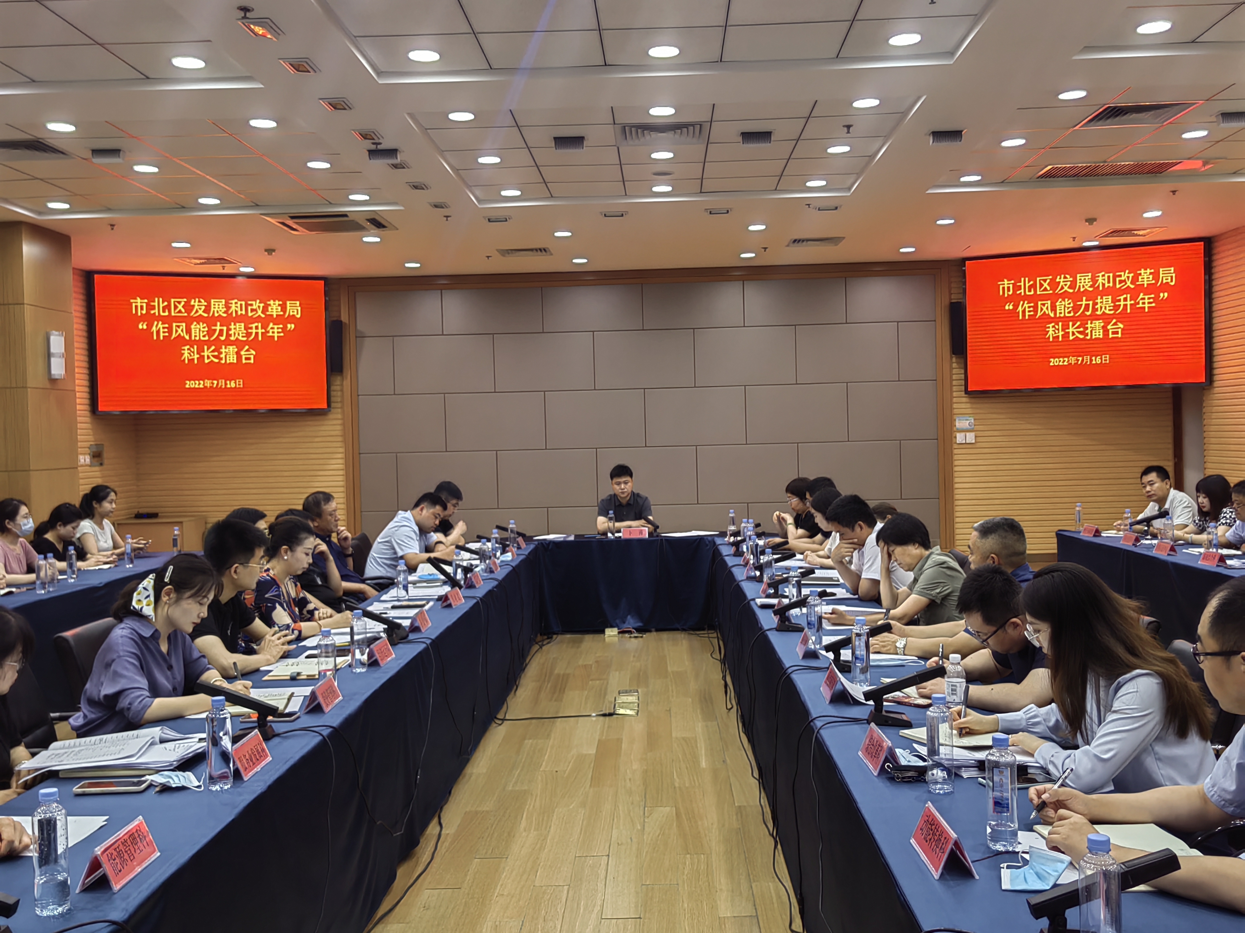 为推动“作风能力提升年”活动扎实开展,弘扬实字当头干字为先的“实干家”精神,市北区发改局以局中坚力量---科级干部为工作切入点,以作风能力提升为抓手,组织全局16名科室负责同志对标2022年区市考核指标,聚焦高质量高效率落实,深入分析了前期重点工作进展情况及存在问题,亮成绩、补短板、谈打算,现场接受评议,分管领导一对一点评,主要领导精准总结,全体机关干部集体观摩督战。