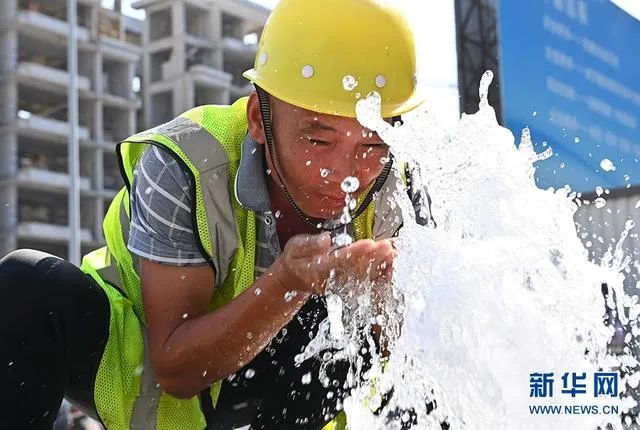 建筑工人洗脸解暑。新华网发(孙凯芳 摄)