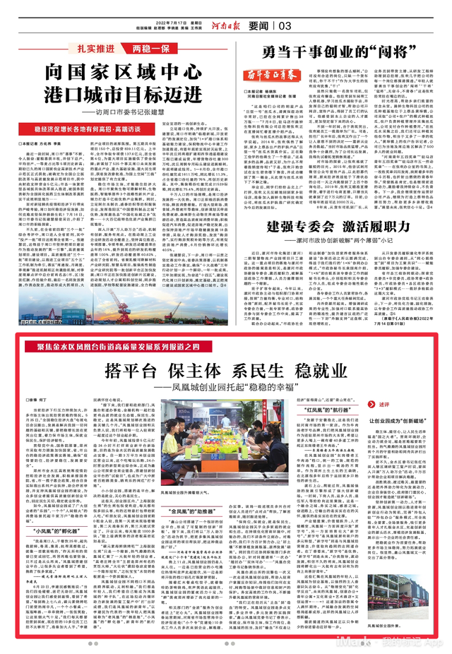 郑州市金水区高效统筹疫情防控和经济社会发展,积极承接国务院、省、市一揽子惠企政策,结合自身实际推出系列产业扶持、助企纾困举措,并支持凤凰城创业园的建设,为众多创业者提供高质量创新创业平台,回应民生关切,稳定就业形势。