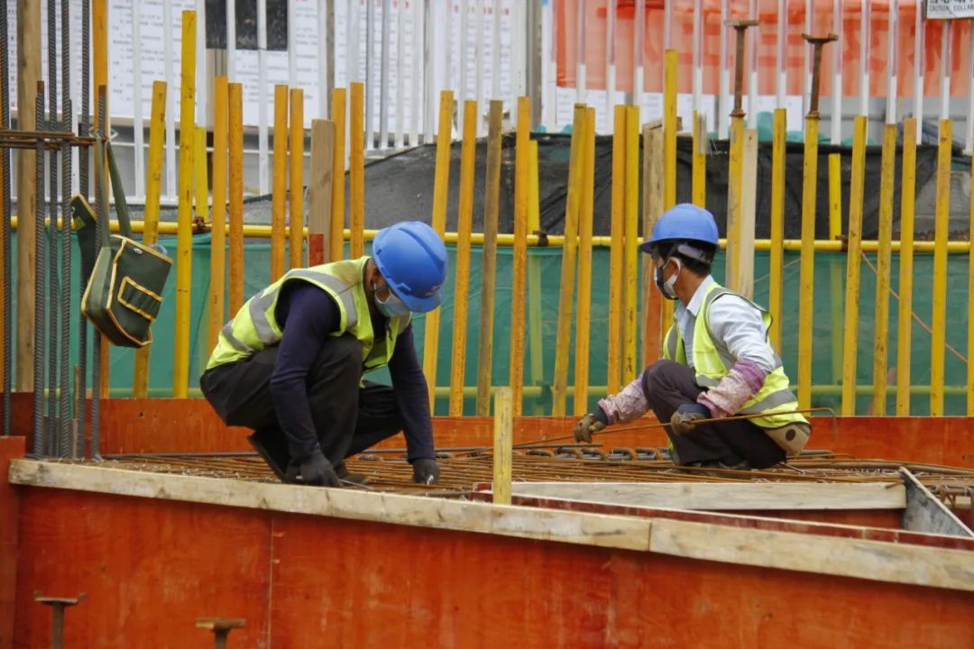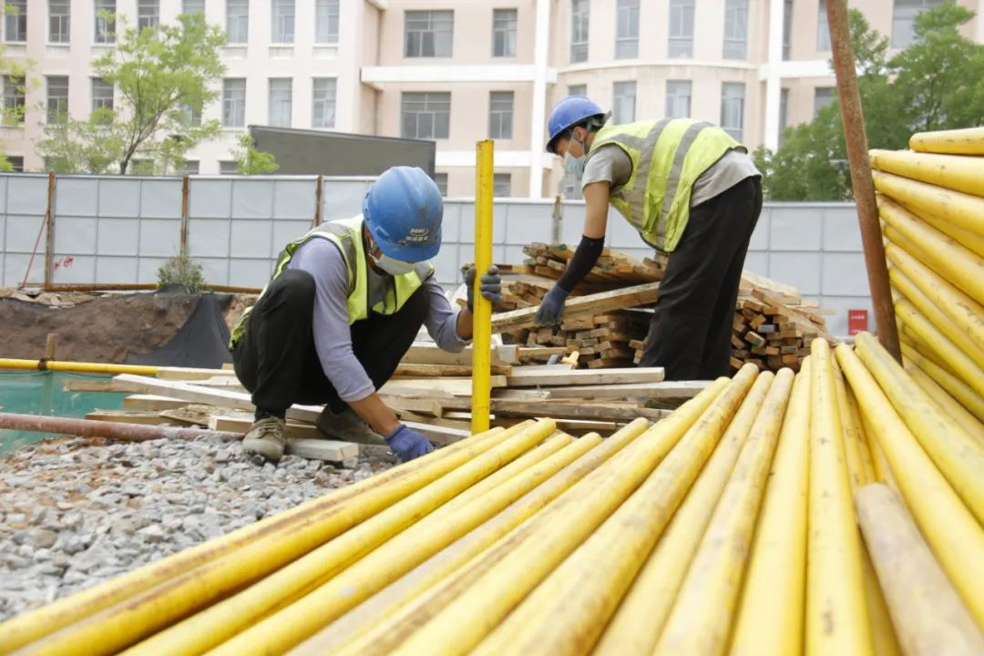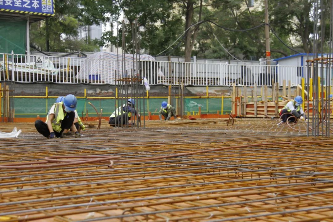 7月17日,走进白银市第二中学附设幼儿园建设项目现场,施工人员正佩戴口罩,按照各自分工,捆绑钢筋、测量数据、运送材料等,各项工作正在井然有序地进行当中。