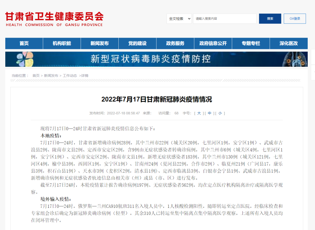 现将7月17日0—24时甘肃省新冠肺炎疫情信息公布如下: