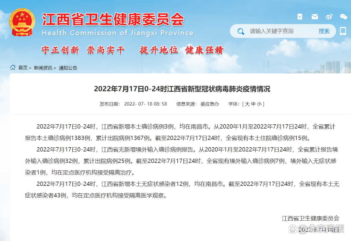 2022年7月17日0-24时,江西省新增本土无症状感染者12例,均在南昌市。截至2022年7月17日24时,全省现有本土无症状感染者43例,均在定点医疗机构接受隔离医学观察。