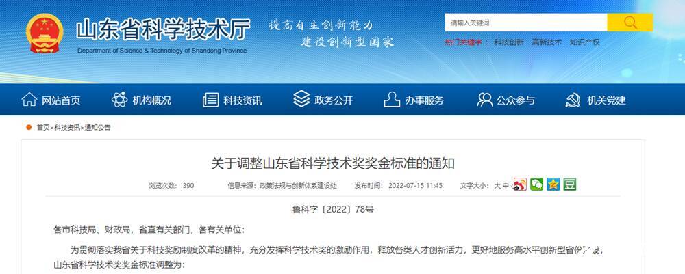 据了解,近日省科技厅联合省财政厅印发了《关于调整山东省科学技术奖奖金标准的通知》,除增设的青年奖和特等奖外,其他奖金标准不变。自2022年度起,省科学技术奖励奖金标准为:省科学技术最高奖300万元/人,省科学技术青年奖50万元/人,全部属获奖人个人所得;省自然科学奖、技术发明奖、科学技术进步奖特等奖100万元/项,一等奖30万元/项,二等奖20万元/项。