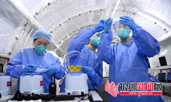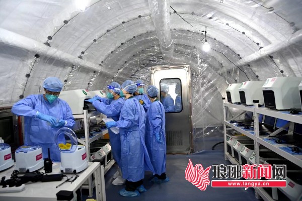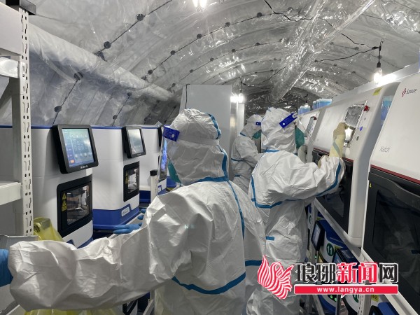 市人民医院检验医学中心主任、实验室负责人高春海告诉记者:“受市卫健委委托,我们医院赴兰陵组建核酸检测气膜实验室,目的是更快、更好地将兰陵县核酸采样结果分析出来,更好地为兰陵人民服务。接到任务后,我们用最快速度组建了23人团队,包括检测人员13人、样本接收人员6人、后勤保障人员4人。在市、县相关部门协助下,7月10日23点,气膜实验室安装场地供电线路铺设完成,不到48小时就完成了实验室搭建及设备安装,今天正式开始接收样本。”