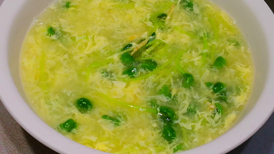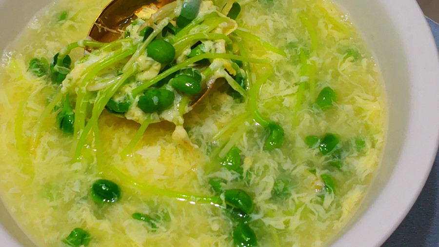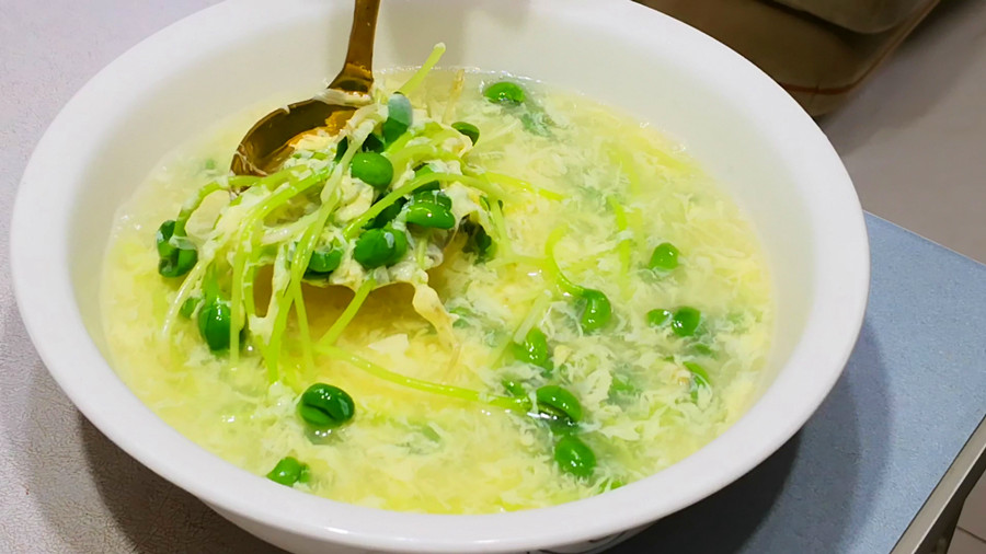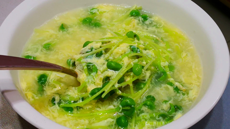 3.接着起锅加入一大碗清水,大火烧开后加入一匙食盐、一匙白糖、适量的胡椒粉调味,搅拌均匀后再倒入水淀粉,然后继续大火烧开后再倒入打散的蛋液,一只手倒蛋液,另一只手要不停地搅拌,这样做出的蛋花非常漂亮,等蛋液成漂亮的蛋花状后即可关火。将蛋花汤浇到之前焯好水的黑豆苗中,搅拌均匀后再滴入几滴香油,美味即成!