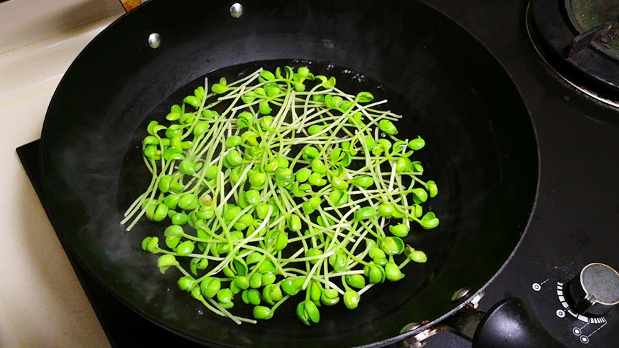 1.先将黑豆苗清洗几遍,然后剪去根部,再起锅加水,水开后放入黑豆苗进行焯水,将黑豆苗焯至断生后捞出过凉开水,然后控干净水分放入碗中备用。