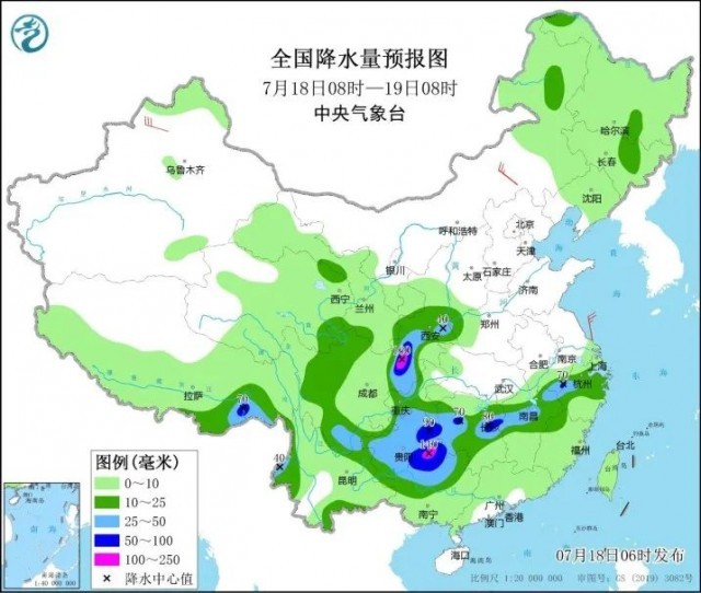7月18日08时至19日08时,内蒙古东部、吉林北部、黑龙江南部、四川盆地中东部、川西高原、重庆、贵州、云南西部和北部、广西中北部、湖南中部、江西中部、浙江中部、安徽南部以及西藏东南部等地的部分地区有中到大雨,其中四川盆地北部、陕西西南部、贵州东部、广西北部、湖南中部等地局地有暴雨或大暴雨(100至160毫米)。新疆北部等地的部分地区有4至5级风。东海北部海域将有6至7级、阵风8级的西南风。