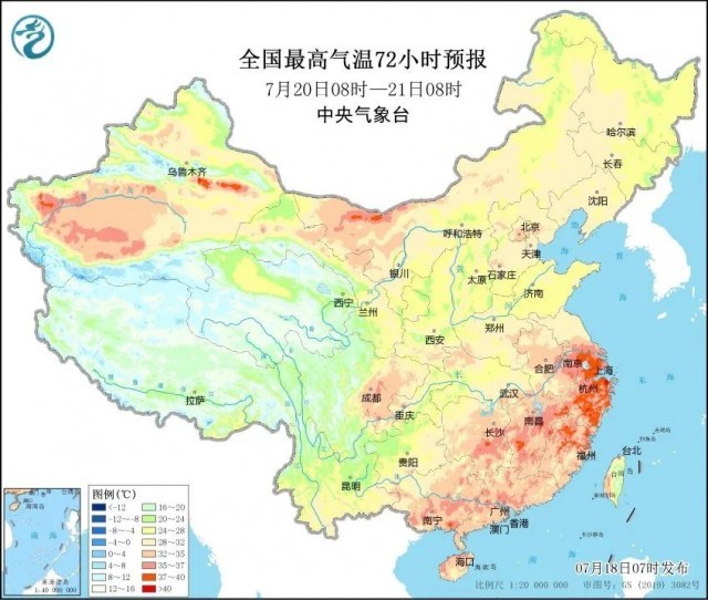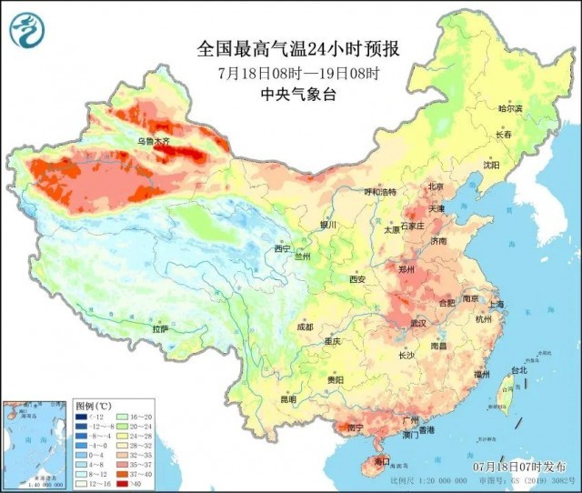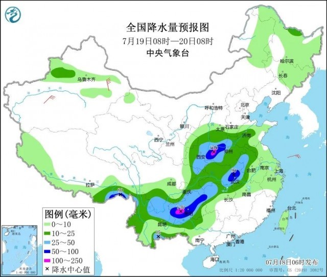 7月19日08时至20日08时,陕西中南部、四川南部和东北部、重庆东南部、贵州、云南北部、湖南北部、湖北东部和西部、安徽西北部、山西南部、河南西部等地的部分地区有大雨或暴雨,其中,贵州西部、河南西部等地局地有大暴雨(100至150毫米)。新疆南疆盆地和东部等地部分地区有5至7级风。东海北部将有5至7级、阵风8级的西南风。