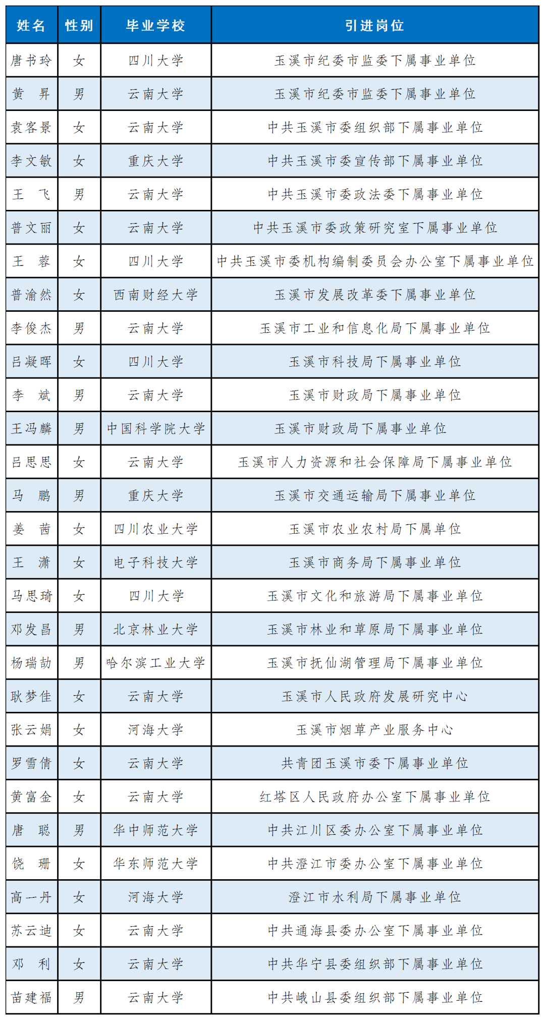 根据《玉溪市人才工作领导小组关于印发<玉溪市党政干部储备人才专项实施方案&的通知》(玉党人才〔2021〕2号)文件精神,经个人报名、资格审查、面谈、体检、考察等程序,现将玉溪市2022年党政干部储备人才专项拟引进人员(排名不分先后)予以公示: