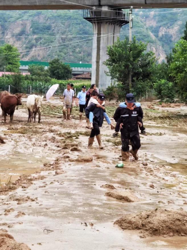 7月15日,甘肃省庆城县公安局民警辅警转移受灾群众。刘东摄
