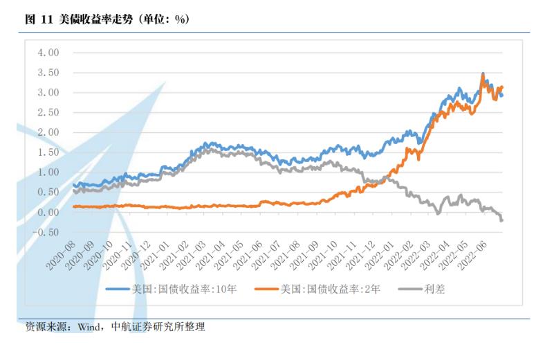 研报提到,目前,10年及两年美债利差倒挂幅度已明显加剧。考虑到7月以来石油、能源及大宗商品价格普遍下跌以及通胀的高基数效应,本月通胀或已达到高点。随着通胀的回落,美联储鹰派利立场有望在9月逐步改变,届时美债收益率将进入下行阶段。但短期内,美债利率仍将先反映流动性的收紧。