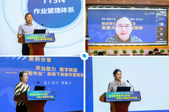 在案例分享环节,七宝三中校长程庆,罗阳小学教导处主任郭毅,金汇高中教导处主任殷佩玉,蔷薇小学英语教师顾馨远分别从学校、教研组、教师等不同层面分享实践经验,借助“闵智作业”探索提质增效、减轻师生负担的路径。