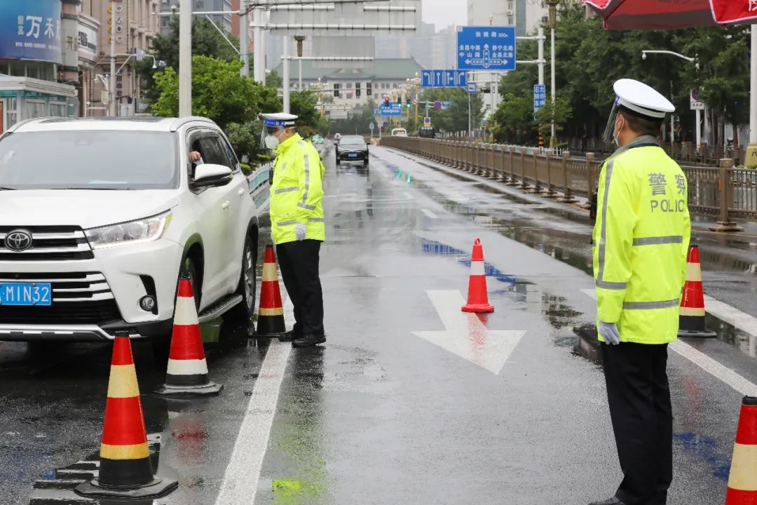 皋兰公安民警在雨中坚守疫情防控卡口点,24小时不间断对出入车辆和人员进行检查。