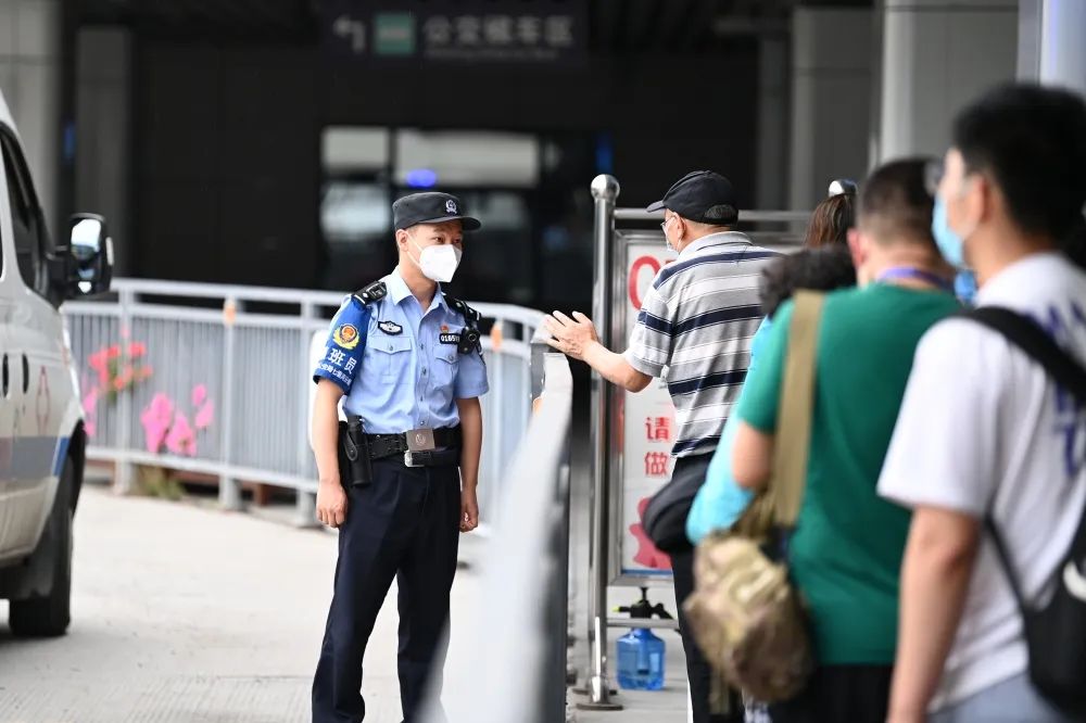 在西客站公交站,执勤民警切实提高管事率,积极开展查验劝返工作,防止人员聚集。