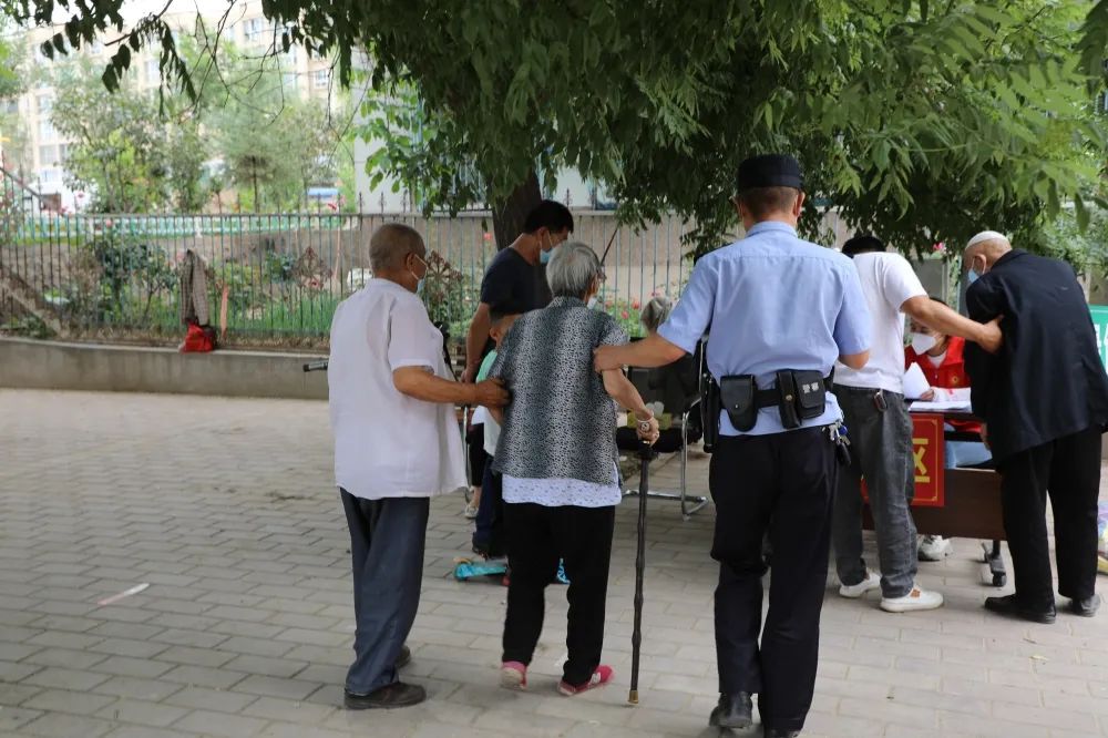 红古分局海石湾派出所民警在核酸采样点主动搀扶行动不便的老人进行核酸采样。