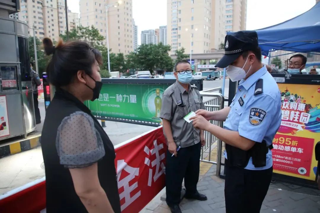 安宁分局沙井驿派出所执勤警力在居民区执勤点检查辖区居民《出入证》。