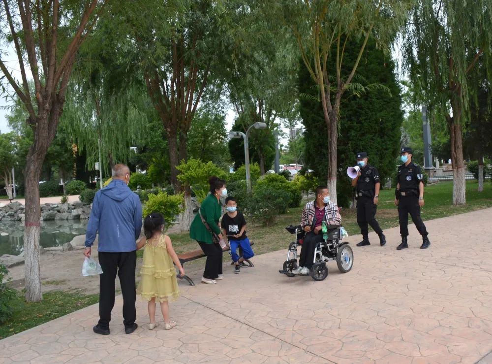 永登公安巡逻特警队员在公园等公共场所手持小喇叭劝导群众戴口罩少聚集不出门。
