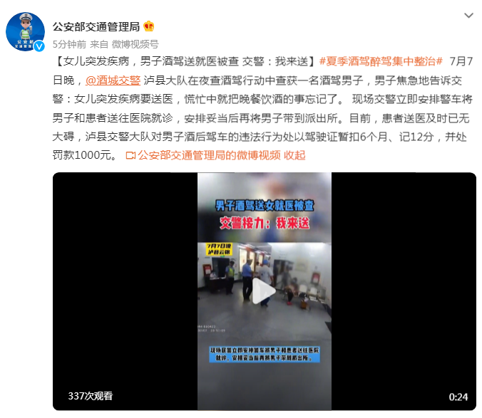 近日,@酒城交警 泸县大队在夜查酒驾行动中查获一名酒驾男子,男子焦急地告诉交警:女儿突发疾病要送医,慌忙中就把晚餐饮酒的事忘记了。 现场交警立即安排警车将男子和患者送往医院就诊,安排妥当后再将男子带到派出所。目前,患者送医及时已无大碍,泸县交警大队对男子酒后驾车的违法行为处以驾驶证暂扣6个月、记12分,并处罚款1000元。