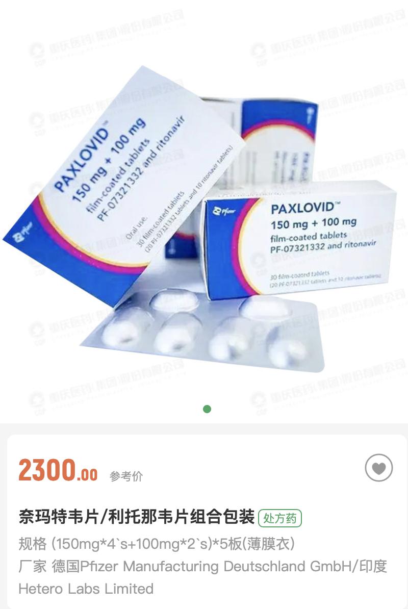 中新经纬7月18日电 (王玉玲)18日,有消费者发现新冠病毒治疗药物奈玛特韦片/利托那韦片组合包装(即Paxlovid)疑似在国内药房上架,小程序“和平新健康药房”显示,可提交愿望单,需要拍摄药品正面包装图或处方图,参考价为2300元。