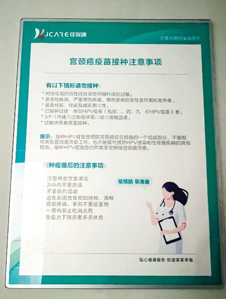 青岛市李沧区家佳康社区卫生服务中心预防接种门诊处张贴的宫颈癌宣教海报。