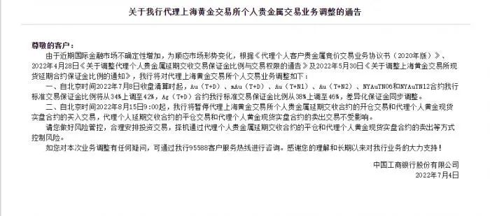 7月4日,工商银行称,将对代理上海黄金交易所个人交易业务进行调整。
