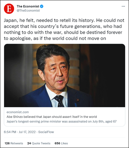 据前后文看,安倍所谓“日本不该无休止地道歉”,是他认为中韩等战争受害国总是“借着历史问题打压日本”,百般阻挠日本成为世界大国。而作为媒体,《经济学人》在转述时也基本不加辩证地信服了安倍的观点,并替安倍广泛传播。
