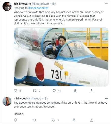 一位网民放出了一篇关于安倍对历史问题态度的文章,封面是安倍坐在编号为“731”的战斗机的图片,而看过这篇的网友表示:“上面的文章有许多关于731部队的资料,我们在学校很少学到这些,这太吓人了。”