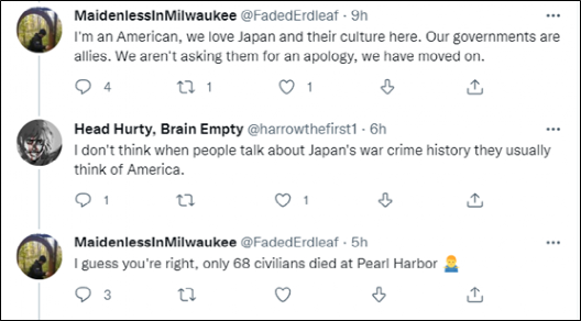 一位网民回复这个美国人道:“我觉得大家说到受害国时,一般说的都不是美国”,而这个美国网民自己则表示:“或许你说得对,毕竟美国只有68位平民在珍珠港事件中遇难”。
