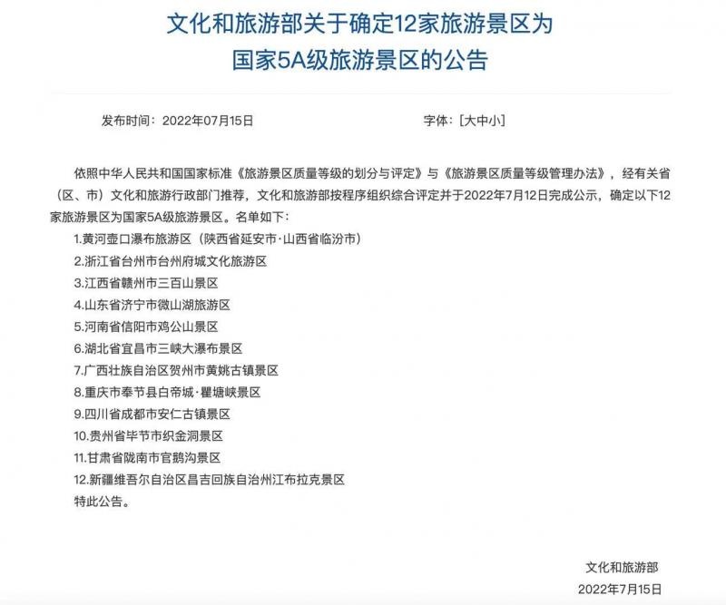 文化和旅游部日前发布公告,将12家旅游景区确定为国家5A级旅游景区。美团数据显示,名单公示期间,12家旅游景区搜索量环比6月同期平均增长幅度达125%。这些新晋5A级旅游景区很可能将成暑期出游新热点。