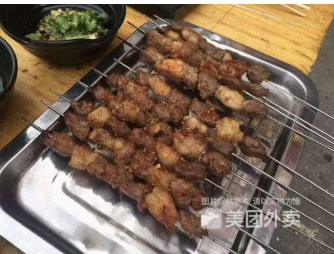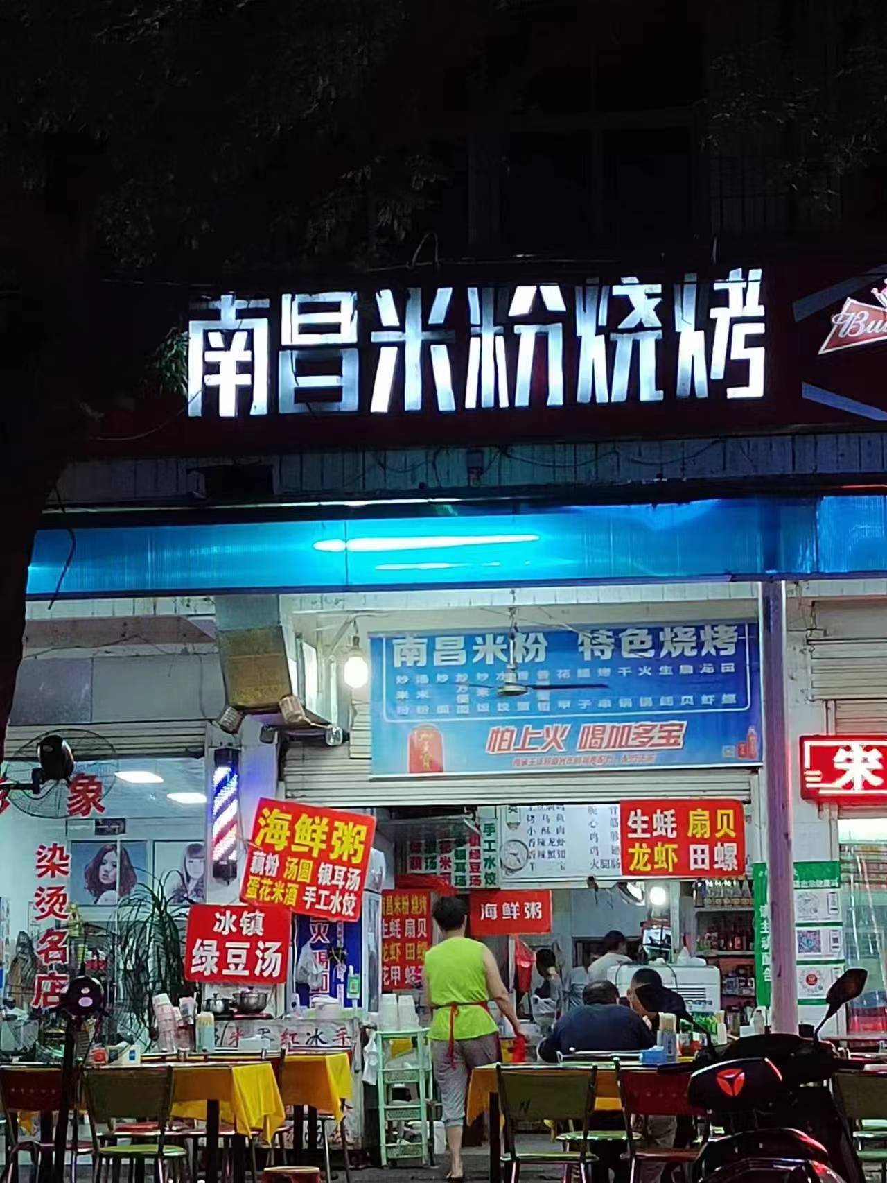 夜幕降临的夜市小吃街灯火通明,人头攒动,各家门店、大排档生意红火,车辆摩托井然停放,食客们从四面八方赶来,三五落座,开怀畅饮。我们熟门熟路地找到夜幕下招牌闪闪发光的名为“南昌米粉烧烤”的档口,不等精干的老板娘招呼,仿佛回到自己的家里一样,随口一句“老规矩”。戴着眼镜、脖子上永远挂条白毛巾的的瘦高个男老板还没等迎出,就又默契转身返回操作间:老规矩“两份微辣炒米线、两份藕粉、烤串三十元”!那洪亮悠长的声音在排档里划过,热情又幽默。
