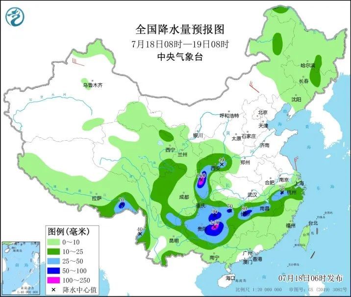 7月18日08时至19日08时,内蒙古东部、吉林北部、黑龙江南部、四川盆地中东部、川西高原、重庆、贵州、云南西部和北部、广西中北部、湖南中部、江西中部、浙江中部、安徽南部以及西藏东南部等地的部分地区有中到大雨,其中四川盆地北部、陕西西南部、贵州东部、广西北部、湖南中部等地局地有暴雨或大暴雨(100至160毫米)。新疆北部等地的部分地区有4至5级风。东海北部海域将有6至7级、阵风8级的西南风。