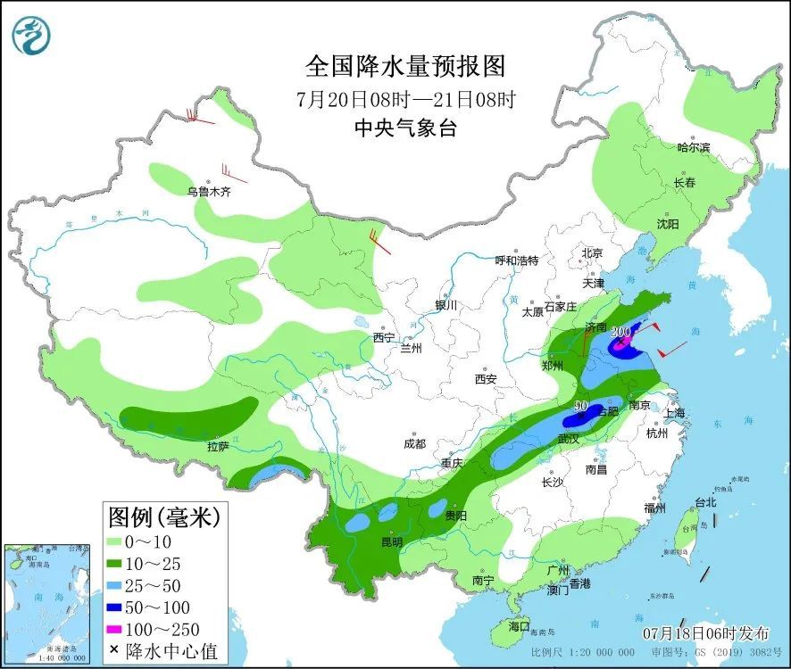 7月20日08时至21日08时,山东南部、江苏北部、安徽北部和西部、湖北东部和南部、湖南北部、贵州西部、云南北部等地的部分地区有大雨或暴雨,其中,山东东南部等地局地有大暴雨(100至200毫米)。内蒙古西北部、新疆北部、山东南部、苏皖北部等地部分地区有4至6级风。黄海中部将有6至7级、阵风8级增大到7至8级、阵风9级的旋转风,黄海南部将有5至7级、阵风8级的旋转风,东海大部将有5至6级、阵风7级的偏南到西南风。